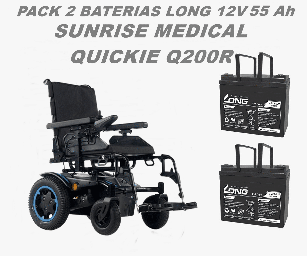 Este producto es un pack de 2 baterías Quickie Q200R, diseñado como recambio específico para la silla eléctrica Quickie Q200R de la marca Sunrise Medical.