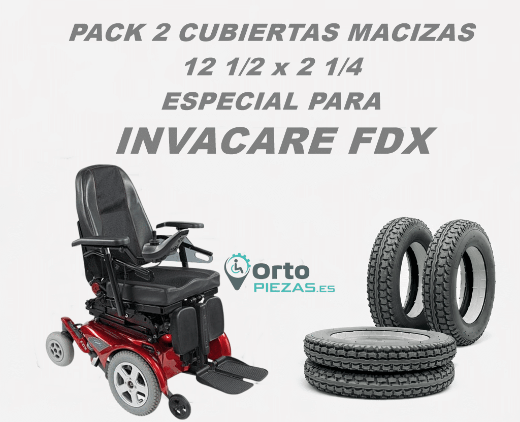 Recambio específico para silla Invacare FDX. Pack de 2 cubiertas macizas antipinchazos 12 ½ x 2 ¼ (ETRTO 62-203). Sin aire, sin pinchazos y mayor durabilidad.