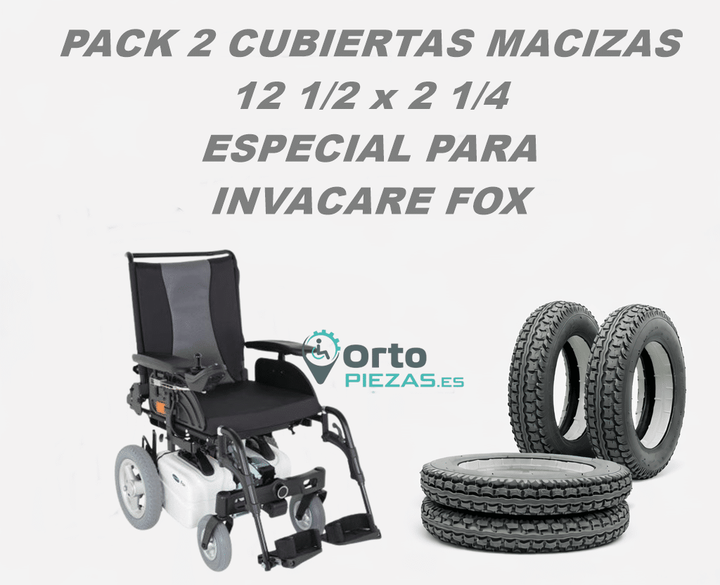 21% de IVA incluidoRecambio específico para silla Invacare Fox. Pack de 2 cubiertas macizas antipinchazos 12 ½ x 2 ¼ (ETRTO 62-203). Sin aire, sin pinchazos y mayor durabilidad.